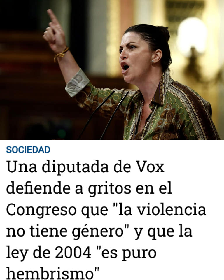 Cuando alguien haga la historia del parlamentarismo español a partir de Vox -creo que algún analista debería intentar el estudio del renacimiento del neofranquismo en nuestra democracia-, va a encontrar piezas tan abundosas de ignominiosos dislates como la protagonizada por una diputada del citado partido al negar -en un estado de excitación retórica casi febril del que debería cuidarse- la existencia de la violencia de género en nuestro país, teniendo como tenemos ejemplos tan descarnados como el ocurrido recientemente y que a continuación comenta Pablo Álvarez. Pareciera que a la soflama atrabiliaria de esa sujeta hace unas fechas, desde la tribuna del Congreso, le respondiera la realidad flagrante con el caso del agresor de Ana María y sus hijas -diez veces denunciado por la víctima- para ratificar lo que sobradamente demuestran los múltiples asesinatos del terrorismo machista que se dan en España, cuya incidencia informativa en los medios de comunicación televisivos sigue ocupando lugares secundarios.