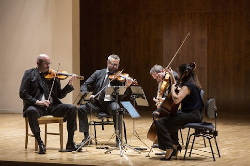 “El pájaro” de Haydn fue, según revelaron unas cartas de 1781, el modelo inequívoco del cuarteto “De las disonancias” de Mozart. Los Quiroga fueron conduciendo los primeros acordes del adagio del primer movimiento de forma sinuosa, como si no quisieran que percibiéramos que se los pasaban de unos a otros, envolviéndose en la tonalidad. En el segundo movimiento, se fue entretejiendo más y más la disonancia dibujada en los arcos. Una conversación entre el violín primero y el cello fue in crescendo acompasada por el violín segundo y la viola, que atestiguaban a negras el encuentro. Alguna inevitable patada al suelo terminó de confirmar la indudable crecida de intensidad del tercer movimiento, para llegar a un cuarto en el que los colores seguían brotando de las cuerdas e hipnotizaban a quien los estuviera escuchando. El apoyo, el entendimiento y la unidad que se palpaba en las tablas del escenario iba mucho más allá de la partitura. Pasaban de la más pura delicadeza a la pasión desenfrenada y vuelta al piano, como si rozaran la esquizofrenia. Realmente los Quiroga estaban plasmando en sus instrumentos el espíritu operístico de Mozart como si de personajes se trataran.